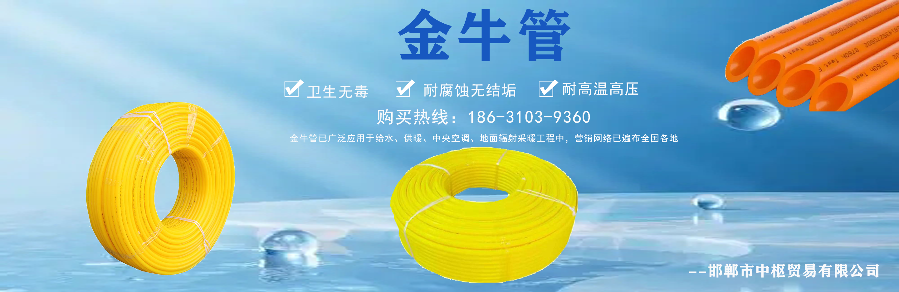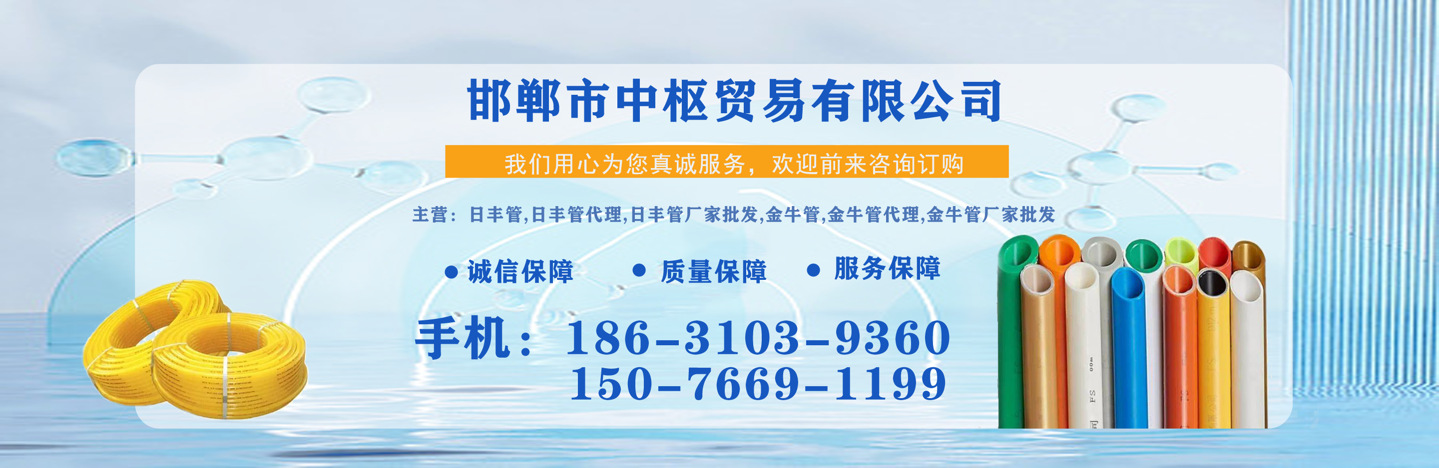 邯鄲市中樞貿易有限公司主營日豐管,日豐管代理,日豐管廠家批發,金牛管,金牛管代理,金牛管廠家批發等,質量可靠,值得信賴!  我公司在產品行業積累了豐富的經驗,具有嚴格的管理制度,同時引進先進的生產設備和生產技術,一如既往的為廣大客戶提供質優價廉的產品。創辦多年來在市場上贏得較好的口碑,銷售網絡覆蓋全國各個省市及地區。  質量為先,信譽為重,管理為本,服務為誠,我們將致力于這一經營理念,關注時代發展,用先進的技術,不斷創新求實,以更優的質量,更好的服務來滿足我們的廣大客戶?! 」纠砟睿河掠谶M取、開拓創...